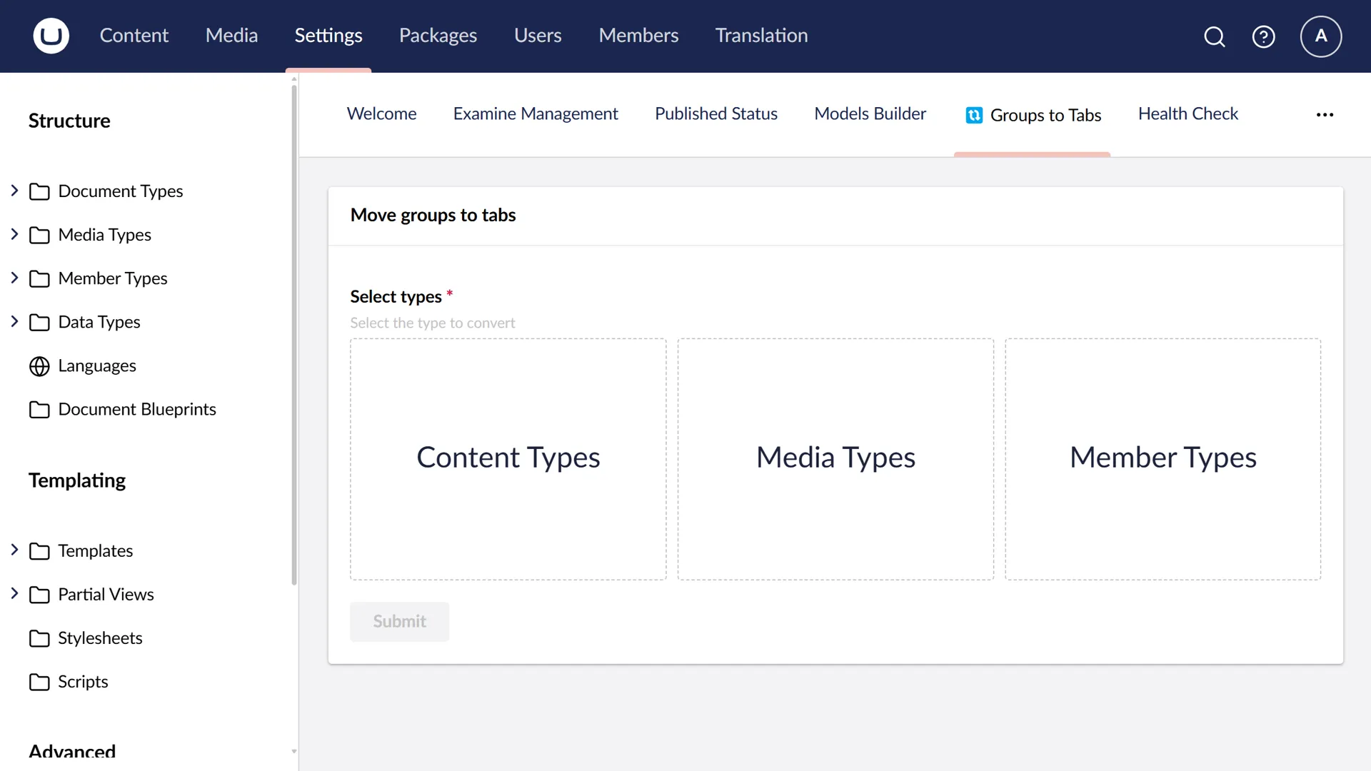 A simple Umbraco package that converts content type groups into tabs in the Umbraco backoffice.